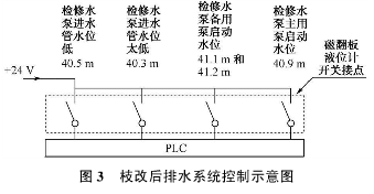 它結構是利用旁通管的原理,主導管內的液位和尾水管內的液位高度一致,根據(jù)阿基米德定理,磁性浮子在液體中產生的浮力和重力平衡,當尾水管中的水位升降時,液位計主導管內的浮子也隨之升降,浮子內的永久磁鐵通過磁耦合驅動指示器內的翻板指示器,當液位上升或下降時,翻板指示器由白色翻轉為紅色,或由原來的紅色翻轉為白色,指示器的顏色改變的高度就是被測水位的實際高度,從而實現(xiàn)液位的現(xiàn)場指示,以供運行人員目測尾水管的實時水位。安裝于液位計管壁外側的磁記憶開關,可多點設置、滑動調整位置,提供了液位開關量報警功能。在裝置的頂部安裝了一個自動排氣裝置,當主導管內液位上升時能夠自動的排氣,下降時能夠按時補氣?,F(xiàn)場安裝頂裝式磁翻板液位計時,裝置標尺的0位,對應的實地高程為EL.40.0m。浮子開關設定5個水位動作值,檢修水位低開關量報警值對應的高程為40.3m;停止所有檢修水泵的開關量,所對應的高程為40.5m;啟動主用檢修水泵的開關量,所對應的高程為40.9m;啟動檢修水泵主用泵的開關量,以及要求手動啟動大泵,并作為水位高報警上送上位機,所對應的高程為41.1m與41.2m,兩個開關量并列接入。全部開關量分別送入PLC,如圖3所示。