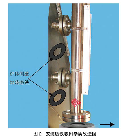 在實際運行中,爐體材質遇到高溫,產生金屬氧化物等雜質,不但爐體內水質變差,同時使水位計的磁性浮球因吸附雜質而卡死,導致現場水位計、遠程控制儀表均無法觀察真實水位,加熱爐常因此發生低水位誤報警并停爐,影響生產運行。