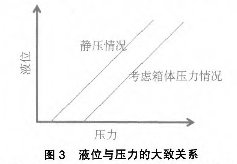 針對設備的故障,技術人員采取了更換多種質量好的磁感應開關(如耐高溫型等),以及基于磁翻板的外貼式模擬量液位控制,但效果均不理想。其他液位測量(如超聲波等)造價較高,而且需要對設備進行相應的改造,并且停運一段時間,而該系統(tǒng)屬于公用,上述條件均無法滿足。既要實現(xiàn)自動控制,又要相應允許實施。技術人員再次結合系統(tǒng)圖進行了分析:該水位溢流處和下限處范圍還是比較寬裕,而且箱體為非承壓容器,所以箱體內的壓力和大氣壓相差不大,即便是有也基本上保持恒定,結合原水位測量的結構,考慮在帶報警開關磁翻板液位計的液位測量筒下部加裝1臺壓力變送器,在箱體壓力不是很大且基本恒定的情況下,液位與壓力值基本成對應關系(只是在現(xiàn)場修正疊加一個常數值來消除箱體上不恒壓所帶來的偏差)。液位與壓力的關系曲線見圖3。