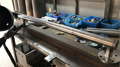 3、焊接法蘭,對主管頂端封頭進行焊接;法蘭和通液管的連接(焊接)并矯正兩法蘭的水平度