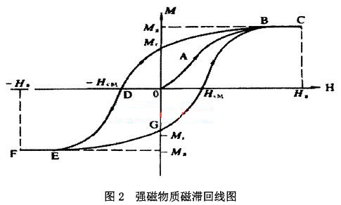 磁開關(guān)內(nèi)部裝有鐵質(zhì)的彈性簧片,在低頻磁場中,鐵質(zhì)簧片被磁化,從而使彈性簧片吸合導(dǎo)通,而油位計(jì)內(nèi)部磁翻板未達(dá)到磁開關(guān)動(dòng)作值的位置,所以監(jiān)控誤報(bào)油位異常信號(hào)。當(dāng)機(jī)組停機(jī)時(shí),勵(lì)磁電纜中電流消失,但此時(shí)磁開關(guān)誤動(dòng)作信號(hào)并未復(fù)歸,下面將通過磁滯回線的概念來解釋此現(xiàn)象。