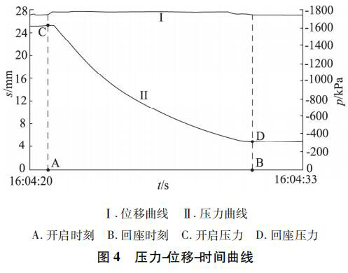 運用安全閥冷態試驗裝置對該立式儲罐液位計進行動作性能試驗,將試驗容器內的介質壓力卸放到整定壓力以下,開啟試驗容器和安全閥進口端的球閥,關閉流量計管路閥門,開啟主測試管路截止閥,開啟儲氣容器通向試驗容器的節流閥,逐漸加壓,同時啟動計算機數據采集系統,被試安全閥開啟,繼續升高壓力,直至被試安全閥保持全開啟( 排放) 狀態,然后關閉儲氣容器通向試驗容器的閥門,被試安全閥亦逐漸關閉。計算機自動生成試驗過程的壓力、位移曲線,試驗人員記錄采集開啟壓力、排放壓力、回座壓力、開啟高度等數據。重復上述試驗至少 3 次,得到相應壓力-位移-時間曲線,見圖 4。左縱坐標為位置,右縱坐標為壓力,其中上部曲線代表導閥位移,下部曲線代表壓力變化。當導閥位置發生變化,代表導閥開始開啟動作,此時的壓力為該立式儲罐液位計的開啟壓力,即整定壓力; 當導閥位置回到原點代表導閥已經回座,此時對應的壓力即為回座壓力。