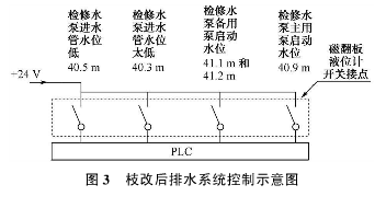 它結(jié)構(gòu)是利用旁通管的原理,主導(dǎo)管內(nèi)的液位和尾水管內(nèi)的液位高度一致,根據(jù)阿基米德定理,磁性浮子在液體中產(chǎn)生的浮力和重力平衡,當(dāng)尾水管中的水位升降時,液位計主導(dǎo)管內(nèi)的浮子也隨之升降,浮子內(nèi)的永久磁鐵通過磁耦合驅(qū)動指示器內(nèi)的翻板指示器,當(dāng)液位上升或下降時,翻板指示器由白色翻轉(zhuǎn)為紅色,或由原來的紅色翻轉(zhuǎn)為白色,指示器的顏色改變的高度就是被測水位的實際高度,從而實現(xiàn)液位的現(xiàn)場指示,以供運行人員目測尾水管的實時水位。安裝于液位計管壁外側(cè)的磁記憶開關(guān),可多點設(shè)置、滑動調(diào)整位置,提供了液位開關(guān)量報警功能。在裝置的頂部安裝了一個自動排氣裝置,當(dāng)主導(dǎo)管內(nèi)液位上升時能夠自動的排氣,下降時能夠按時補氣。現(xiàn)場安裝耐高溫磁翻板液位計時,裝置標尺的0位,對應(yīng)的實地高程為EL.40.0m。浮子開關(guān)設(shè)定5個水位動作值,檢修水位低開關(guān)量報警值對應(yīng)的高程為40.3m;停止所有檢修水泵的開關(guān)量,所對應(yīng)的高程為40.5m;啟動主用檢修水泵的開關(guān)量,所對應(yīng)的高程為40.9m;啟動檢修水泵主用泵的開關(guān)量,以及要求手動啟動大泵,并作為水位高報警上送上位機,所對應(yīng)的高程為41.1m與41.2m,兩個開關(guān)量并列接入。全部開關(guān)量分別送入PLC,如圖3所示。