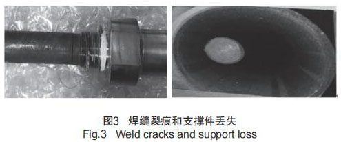 在歷次大修執行 GSS 系統 MSR 食用油液位計預防性維修檢查時發現,部分導波桿支撐件破碎并丟失,同時存在探桿根部焊縫有裂痕的問題,見圖 3 焊縫裂痕和支撐件丟失。