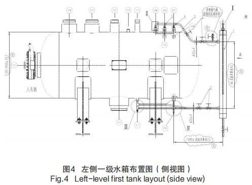 1)在每個疏水箱外部靠近水側取壓口處,安裝 3 個測量筒用于導波食用油液位計的安置以及液位測量;每個測量筒的汽側取壓口仍然選用原導波食用油液位計接口,而水側取壓口引用原水汽取樣口、磁翻板液位計取壓口,以左側一級水箱布置圖為例,見圖 4 左側一級水箱布置圖(側視圖)。