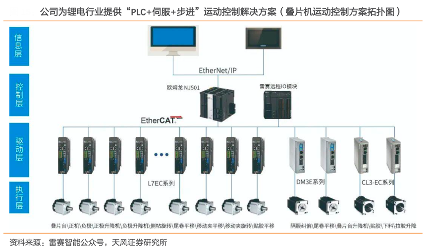 經(jīng)典案例:根據(jù)雷賽智能公眾號(hào)、天風(fēng)證券研究所等綜合資訊表明,雷賽智能公司深耕工控自動(dòng)化領(lǐng)域多年,擁有全品類的產(chǎn)品和產(chǎn)品組合,并在多個(gè)行業(yè)擁有成功的整體解決方案。當(dāng)前公司為較多的戰(zhàn)略性行業(yè)和大客戶提供“PLC 系統(tǒng)+模塊+伺服+步進(jìn)”的整體解決方案,有效地提升了自有產(chǎn)品的配套率(通常控制類產(chǎn)品和驅(qū)動(dòng)類產(chǎn)品的銷售額比例約為 1:4 左右)。