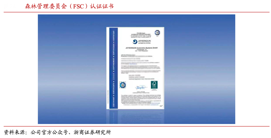 經(jīng)典案例:根據(jù)公司官方公眾號、浙商證券研究所等綜合資訊表明,2022 年,香山股份公司旗下子公 司均勝群英獲得了由 TUV SUD 頒發(fā)的森林管理委員會(FSC)認證證書,成為了業(yè)內(nèi)少數(shù)可提供 FSCTM 認證的汽車座艙內(nèi)飾供應商之一。在公司的智能飾件產(chǎn)品中,真木表面飾件是主要設計與制造方向之一,通過了 FSC 認證證書,對真木飾件的設計更具可持續(xù)發(fā)展意義。