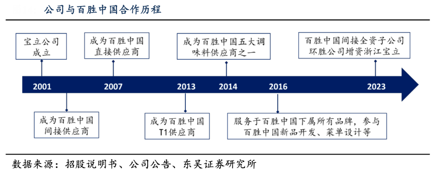 經(jīng)典案例:根據(jù)公司招股說明書、公司公告、東吳證券研究所等綜合資訊表明,寶立食品2016 年以來,雙方已開展全方位的合作,其服務(wù)于百勝中國(guó)下屬所有品牌,參與百勝中國(guó)新品開發(fā)、菜單設(shè)計(jì)等,產(chǎn)品逐漸延伸到腌料、撒粉、調(diào)味醬、沙拉醬、果醬、調(diào)理包、飲品小料和百勝新零售的輕烹食品等多個(gè)品類。2023 年 9 月,百勝中國(guó)間接全資子公司環(huán)勝信息技術(shù) (上海)有限公司增資公司的全資子公司浙江寶立食品科技有限公司,雙方合作進(jìn)一步深化。