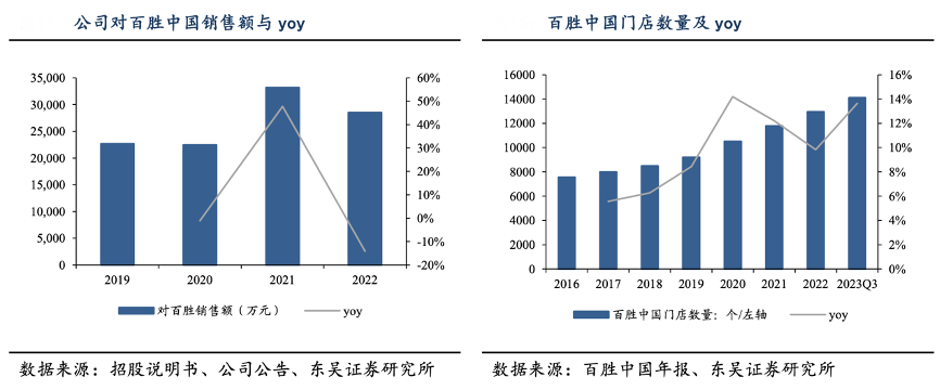 經(jīng)典案例:根據(jù)公司招股說明書、東吳證券研究所等綜合資訊表明,近年來(lái),寶立食品公司對(duì)百勝中國(guó)的銷售額居高不下,百勝中國(guó)一直穩(wěn)定地成為公司的第一大客戶。2022年,公司對(duì)百勝的銷售額高達(dá) 28494.6 萬(wàn)元。與此同時(shí),百勝門店不斷擴(kuò)展,2022 年百勝門店數(shù)量為 12947 家。