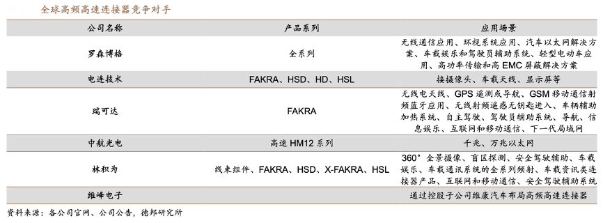經(jīng)典案例:根據(jù)各公司官網(wǎng)、公司公告、德邦研究所等綜合資訊表明,從高頻高速競爭格局來看,國外廠商在車載高速連接器研發(fā)上起步較早, Mini-Fakra、以太網(wǎng)這兩大類連接器,國內(nèi)標(biāo)準(zhǔn)界面相對空白,為國產(chǎn)替代提供了可能。但已經(jīng)有部分上市連接器企業(yè)進(jìn)行相關(guān)的技術(shù)攻克——電連技術(shù)和華為合作開發(fā)以太網(wǎng)界面,產(chǎn)品已成熟導(dǎo)入整車廠,目前維峰電子公司也已通過子公司維康汽車重點(diǎn)部署高頻高速連接器。