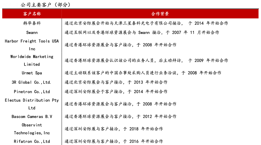 經(jīng)典案例:根據(jù)公司招股說明書、方正證券研究所等綜合資訊表明,安聯(lián)銳視產(chǎn)品主要應(yīng)用于消費級市場,目前已廣泛覆蓋眾多海外頭部品牌。公司的銷售客 戶主要為消費類安防視頻監(jiān)控產(chǎn)品銷售商,包括 Swann、Harbor Freight Tools 等品牌運營商。其中,Swann 是全球民用安防監(jiān)控產(chǎn)品領(lǐng)先品牌,以 DIY 產(chǎn)品為 主,產(chǎn)品主要銷往美國、歐洲、大洋洲等市場。