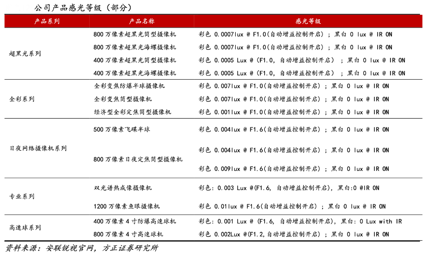 經(jīng)典案例:根據(jù)安聯(lián)銳視官網(wǎng)、方正證券研究所等綜合資訊表明,安聯(lián)銳視核心業(yè)務(wù)攝像機(jī)產(chǎn)品性能領(lǐng)先,感光等級已達(dá)行業(yè)最高水準(zhǔn)。在前端攝像頭領(lǐng)域,夜視圖像效果是監(jiān)控攝像機(jī)選型的重要考量。目前感光等級可分為普通紅外、星光、超星光、黑光等級別。其中,黑光攝像機(jī)的綜合感光能力能夠達(dá)到紅外攝像 機(jī)的 9.36 倍、星光攝像機(jī)的 3.3 倍,是目前行業(yè)內(nèi)最為領(lǐng)先的產(chǎn)品類型。