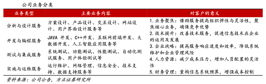 經(jīng)典案例:根據(jù)公司公告、方正證券研究所等綜合資訊表明,法本信息公司的傳統(tǒng)業(yè)務(wù)為客戶提供涵蓋信息技術(shù)系統(tǒng)和產(chǎn)品全生命周期的專業(yè)服務(wù)。具體為企業(yè)為了專注核心競(jìng)爭(zhēng)力業(yè)務(wù)、提高效率和控制 IT 相關(guān)成本,將與軟件相關(guān)的信息技術(shù)系統(tǒng)或產(chǎn)品的全部或部分工作,發(fā)包給專業(yè)軟件和信息技術(shù)服務(wù)企業(yè)去執(zhí)行和完成的活動(dòng)。