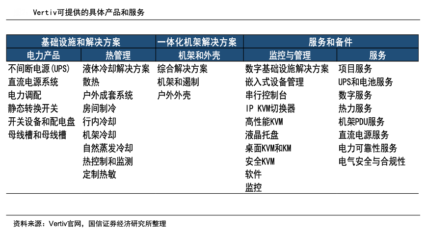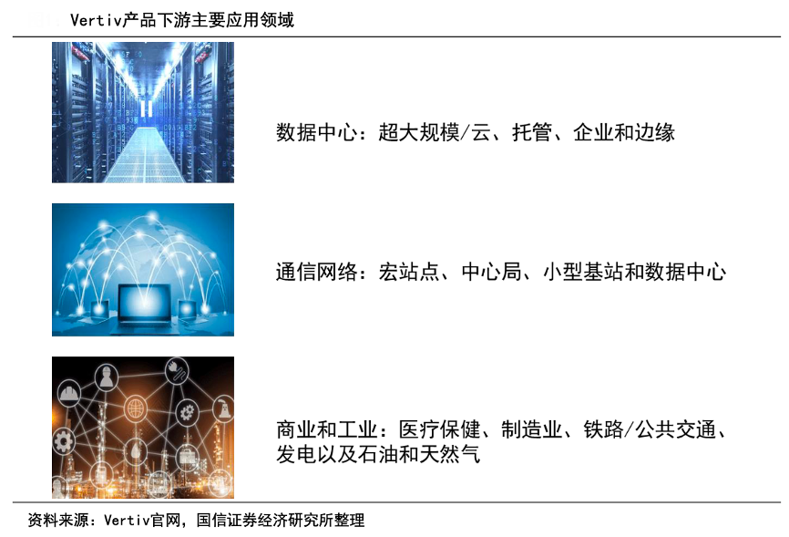 經(jīng)典案例:根據(jù)Vertiv官網(wǎng)、國信證券經(jīng)濟研究所等綜合資訊表明,Vertiv公司業(yè)務圍繞電力、冷卻和IT管理展開,下游主要涉及數(shù)據(jù)中心、通信網(wǎng)絡以及商業(yè)和工業(yè)環(huán)境三大領(lǐng)域。公司主要提供從云到網(wǎng)絡邊緣的電力、冷卻和IT基礎設施解決方案和服務,具體產(chǎn)品包括基礎設施和解決方案(交流和直流電源管理、熱管理、低/中壓開關(guān)設備、母 線槽和集成模塊化解決方案)等。