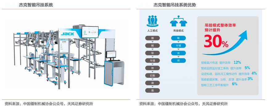 經(jīng)典案例:根據(jù)中國(guó)縫制機(jī)械協(xié)會(huì)公眾號(hào)、天風(fēng)證券研究所等綜合資訊表明,杰克股份公司智能吊掛系統(tǒng)能減少人力、提高效率、優(yōu)化管理。智能吊掛系統(tǒng)是一套智能單軌道、服裝、家紡、汽配等生產(chǎn)流水設(shè)備,采用電腦化管理及數(shù)據(jù)庫(kù)、管理軟件、電子技術(shù)、RFID 射頻技術(shù)、工業(yè)自控技術(shù)及新型傳動(dòng)機(jī)構(gòu)來(lái)代替?zhèn)鹘y(tǒng)生產(chǎn)方式,實(shí)現(xiàn)整個(gè)生產(chǎn)流程的信息化與高效化。智能吊掛系統(tǒng)已經(jīng)切實(shí)應(yīng)用于佳都集團(tuán)、盛寶麗集團(tuán)、可祺時(shí)裝等大型服裝企業(yè),并遠(yuǎn)銷海外越南、緬甸、柬埔寨、泰國(guó)、埃塞俄比亞、孟加拉等國(guó)家。