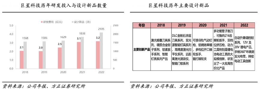 經(jīng)典案例:根據(jù)公司年報(bào)、方正證券研究所等綜合資訊表明,近年來(lái),巨星科技公司研發(fā)投入持續(xù)增長(zhǎng),先后在手工具、激光測(cè)量測(cè)繪儀器、氣 動(dòng)工具、電動(dòng)工具等方面取得突破。