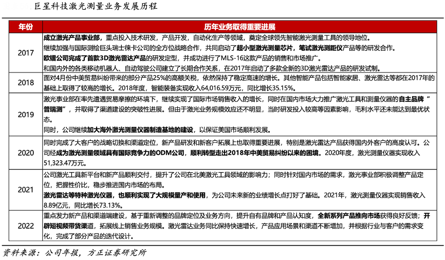 經(jīng)典案例:根據(jù)公司年報、方正證券研究所等綜合資訊表明,巨星科技公司于 2017 年成立激光產(chǎn)品事業(yè)部,此后公司持續(xù)投入研發(fā),加強與國際巨頭合作,并拓展渠道、加強海外制造基地建設,面臨貿(mào)易摩擦依然保持穩(wěn)定增長。成為激光測量領域具有國際競爭力的 ODM 公司,并在激光雷達等特種激光儀器產(chǎn)品實現(xiàn)大規(guī)模量產(chǎn)和應用。