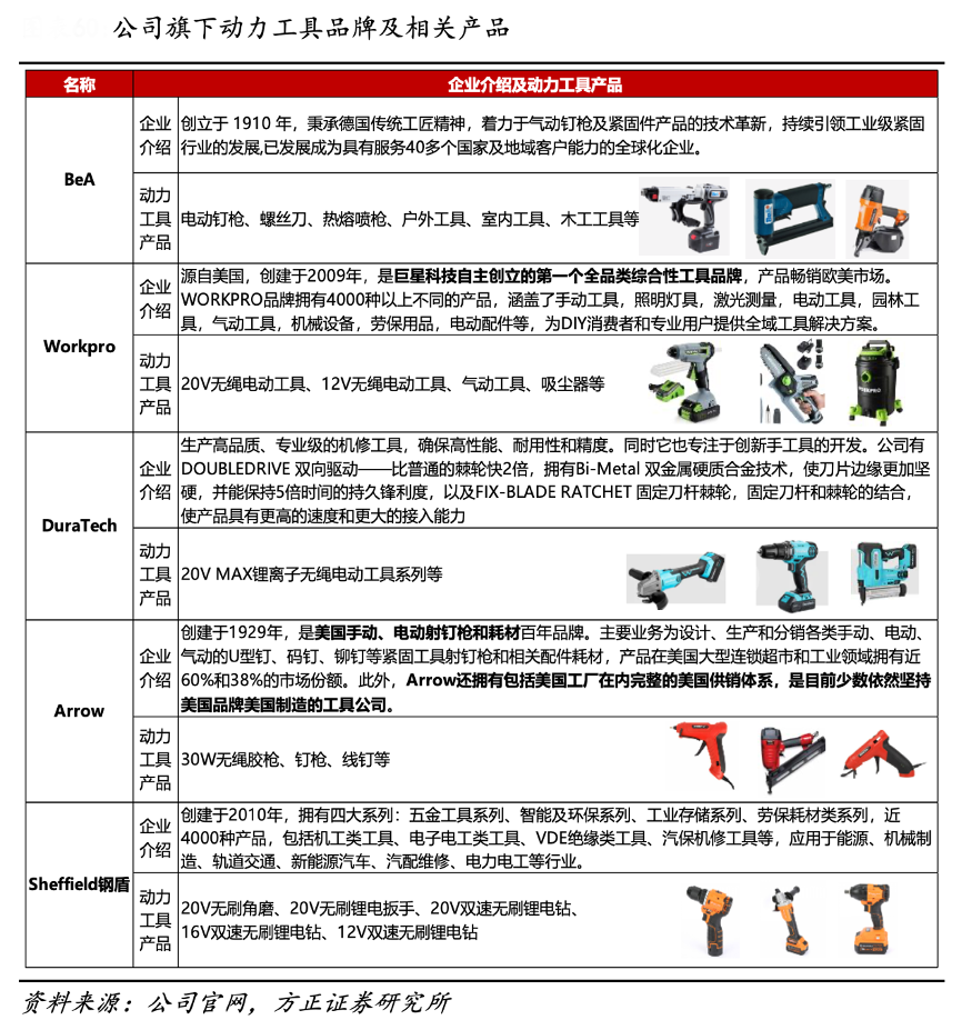 經(jīng)典案例:根據(jù)公司官網(wǎng)、方正證券研究所等綜合資訊表明,巨星科技公司根據(jù)市場需求主動調(diào)整產(chǎn)品供給,優(yōu)先向客戶提供了取暖設(shè)備、家庭儲能設(shè)備,滿足消費(fèi)者的即時需求,延伸公司的產(chǎn)品線,尤其在家用儲能產(chǎn)品上實(shí)現(xiàn)明顯突破;。同時公司在動力工具領(lǐng)域的品牌主要有 BeA、Workpro、DuraTech、Arrow、 Sheffield 鋼盾等。
