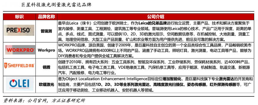 經(jīng)典案例:根據(jù)公司官網(wǎng)、方正證券研究所等綜合資訊表明,目前,巨星科技公司在激光測量激光雷達(dá)領(lǐng)域的品牌主要有普瑞測(Prexiso)、Workpro、 Sheffield 鋼盾、歐蕾激光(OLEI)等品牌。其中,普瑞測是室內(nèi)裝修、測量工 具、工程測繪、建筑施工領(lǐng)域?qū)I(yè)供應(yīng)商,歐鐳激光定位增加智能化,是公司旗下激光雷達(dá)開發(fā)商和制造商,產(chǎn)品可廣泛用于移動測繪、工業(yè)移動機(jī)器人、安防機(jī)器人等領(lǐng)域。