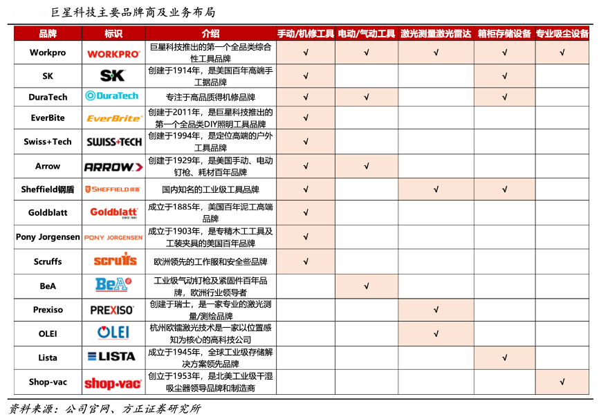 經(jīng)典案例:根據(jù)公司官網(wǎng)、方正證券研究所等綜合資訊表明,目前巨星科技已擁有多個全球知名百年品牌和工具細(xì)分行業(yè)龍頭品牌,涵蓋業(yè)務(wù)有手動工具、電動工具、氣動緊固工具、激光測量工具、激光雷達(dá)、箱柜存儲設(shè)備、工業(yè)吸塵器等。