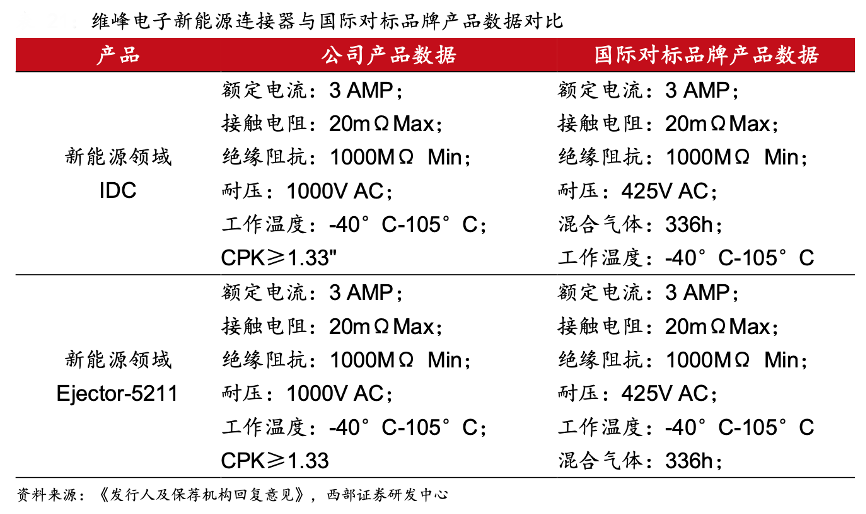 經(jīng)典案例:根據(jù)《發(fā)行人及保薦機(jī)構(gòu)回復(fù)意見》、西部證券研發(fā)中心等綜合資訊表明,新能源連接器生產(chǎn)體系與工控連接器大體通用,維峰電子公司存在制造優(yōu)勢(shì),其憑借工業(yè)控制連接器生產(chǎn)體系和相關(guān)技術(shù),在新能源連接器領(lǐng)域存在一定優(yōu)勢(shì)。目前,公司部分新能源連接器產(chǎn)品已達(dá)到或接近國(guó)際對(duì)標(biāo)品牌技術(shù)水平。