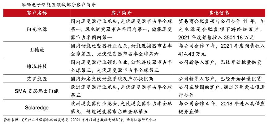 經(jīng)典案例:根據(jù)《發(fā)行人及保薦機(jī)構(gòu)回復(fù)意見(2021年年報(bào)財(cái)務(wù)數(shù)據(jù)更新版》、西部證券研發(fā)中心等綜合資訊表明,在新能源領(lǐng)域,維峰電子公司產(chǎn)品主要應(yīng)用在 太陽能、風(fēng)能和儲(chǔ)能逆變系統(tǒng),對(duì)應(yīng)客戶包括陽光電源、固德威、錦浪科技、艾羅能源、 SMA、Solaredge 等逆變器及其他配件廠商。公司與國(guó)內(nèi)主要新能源企業(yè)合作多年。2020 年合肥鑫碩(陽光電源向公司采購連接器的貿(mào)易商)、固德威兩家企業(yè)占公司新能源業(yè)務(wù) 約 90%,公司與合肥鑫碩合作 11 年,與固德威合作 7 年,客戶關(guān)系穩(wěn)固。。