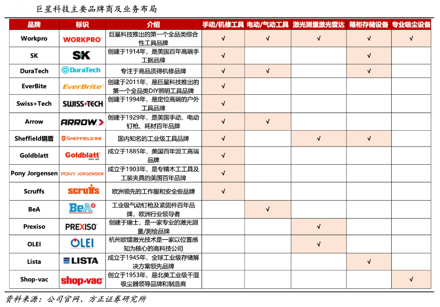 經(jīng)典案例:根據(jù)公司官網(wǎng)、方正證券研究所等綜合資訊表明,目前,巨星科技公司已擁有多個(gè)全球知名百年品牌和工具細(xì)分行業(yè)龍頭品牌,涵蓋業(yè)務(wù)有手動(dòng)工具、電動(dòng)工具、氣動(dòng)緊固工具、激光測(cè)量工具、激光雷達(dá)、箱柜存儲(chǔ)設(shè)備、工業(yè)吸塵器等。