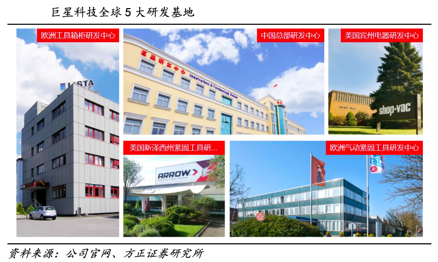 經(jīng)典案例:根據(jù)公司官網(wǎng)、方正證券研究所等綜合資訊表明,巨星科技公司擁有全球化的研發(fā)中心。目前,公司在全球有五大研發(fā)基地,分別是中國總部研發(fā)中心、美國賓州電器研發(fā)中心、美國新澤西州緊固工具 研發(fā)中心、歐洲工具箱柜研發(fā)中心、歐洲氣動(dòng)緊固工具研發(fā)中心。