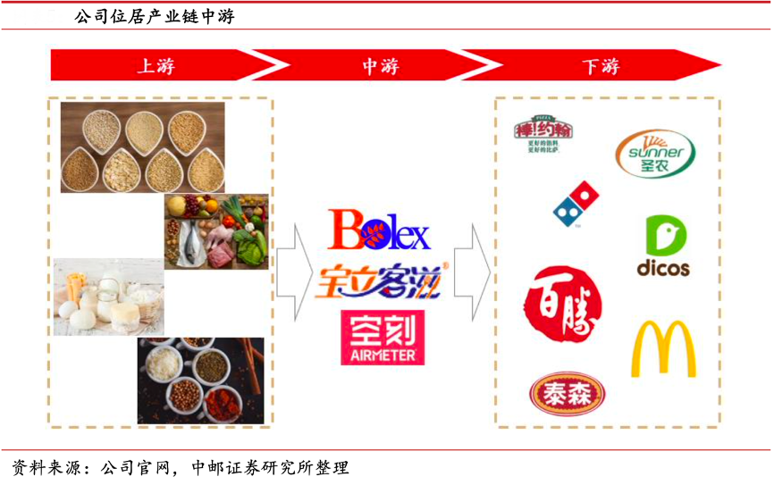 經典案例:根據公司官網、中郵證券研究所等綜合資訊表明,寶立食品公司作為加工環(huán)節(jié)位居調味品產業(yè)鏈中游。其作為中游的加工環(huán)節(jié)制成復合調味粉/醬、料理包、飲品甜品配料等產品后出售給下游的 B 端客戶,如百勝中國、麥當勞、漢堡王等西式快餐、茶飲、咖啡品牌;或直接通過自身空刻/寶立客滋品牌進入 C 端零售渠道。