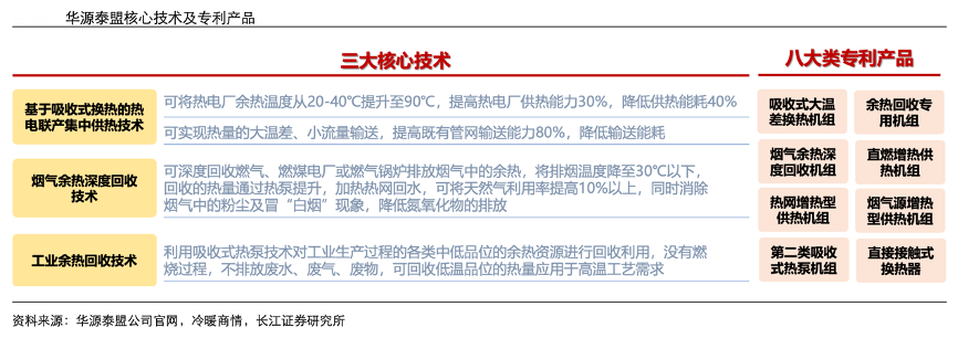 經(jīng)典案例:根據(jù)華源泰盟公司官網(wǎng)、冷暖商情、長江證券研究所等綜合資訊表明,華源泰盟擁有三大核心技術(shù)和8 大類專利產(chǎn)品,可以在提高熱電廠和工業(yè)余熱設(shè)施的供熱能力的同時,減低能耗,減少氮氧化物等污染物的排放,解決當前低品位余熱利用中的痛點。