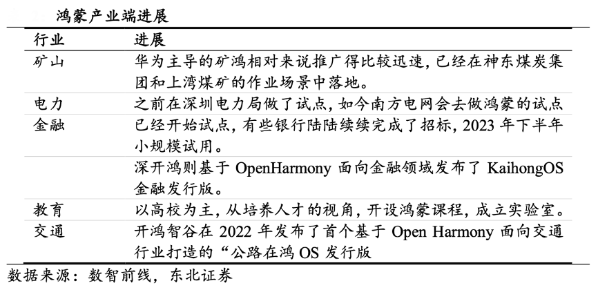 經(jīng)典案例:根據(jù)數(shù)智前線、東北證券等綜合資訊表明,鴻蒙在產(chǎn)業(yè)端的開拓與華為軍團(tuán)緊密配合。華為之前成立的十幾個軍團(tuán),也是鴻蒙進(jìn)展比較快的領(lǐng)域。2022 年,包括各大 ISV 在內(nèi)的第三方伙伴基于 Open Harmony 發(fā)布了 23 個特定行業(yè)的商業(yè)發(fā)行版,已有 79 款商用終端設(shè)備落地,擴(kuò)展到了教育、金融、交通、政務(wù)、工業(yè)等領(lǐng)域。