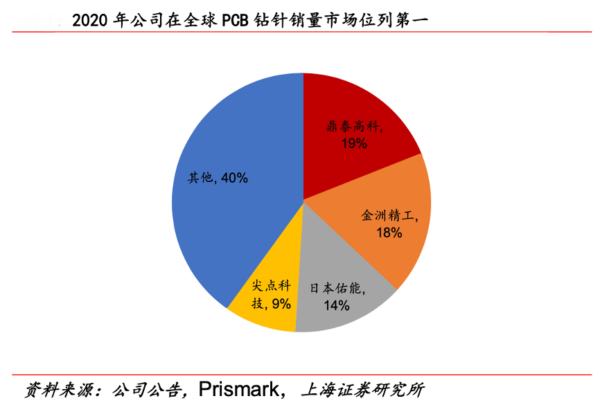 經(jīng)典案例:根據(jù)公司公告、Prismark、上海證券研究所等綜合資訊表明,鼎泰高科是一家專業(yè)為 PCB、數(shù)控精密機件等領(lǐng)域的企業(yè)提供工具、材料、裝備的一體化解決方案,具有自主研發(fā)和創(chuàng)新能力的高新技術(shù)企業(yè)。公司現(xiàn)發(fā)展為國內(nèi) PCB 刀具生產(chǎn)規(guī)模最大的企業(yè),據(jù) Prismark 數(shù)據(jù)顯示,2020年公司在全球 PCB 鉆針銷量市場占有率約為 19%,排名第1位。