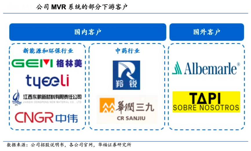 經(jīng)典案例:根據(jù)公司招股說明書、各公司官網(wǎng)、華福證券研究所等綜合資訊表明,亞光股份公司的 MVR 系統(tǒng)在新能源、環(huán)保、中藥行業(yè)的應(yīng)用案例豐富, 已順利服務(wù)格林美、羚銳制藥、華潤(rùn)三九、Albemarle Lithium Pty Ltd等國(guó)內(nèi)外龍頭,由于 MVR 系統(tǒng)屬于高度定制化裝備,因此客戶一旦選中供應(yīng)商一般不會(huì)輕易更換,公司已積累的客戶有望具備較強(qiáng)粘性。