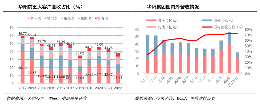 經(jīng)典案例:根據(jù)公司公告、wind、中信建投證券等綜合資訊表明,華陽(yáng)公司前五大客戶占比從 2012 年的近 60%下降至 2021 年的 43%,客戶集中度呈下降趨勢(shì)。長(zhǎng)城汽車(chē)是公司第一大客戶。從營(yíng)收區(qū)域來(lái)源看,公司早期以出口市場(chǎng)為主,隨著長(zhǎng)城、長(zhǎng)安等國(guó)內(nèi)自主車(chē)企崛起,公司國(guó)內(nèi)營(yíng)收快速上升,國(guó)內(nèi)占比從 2012 年的 34%快速上升至 2023 年上半年的 72%,成為公司最重要的增長(zhǎng)動(dòng)力。