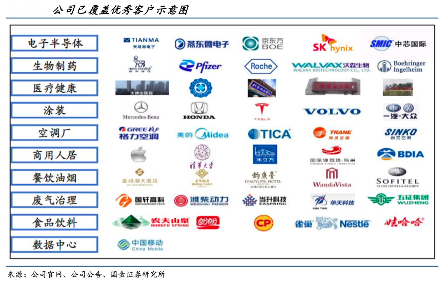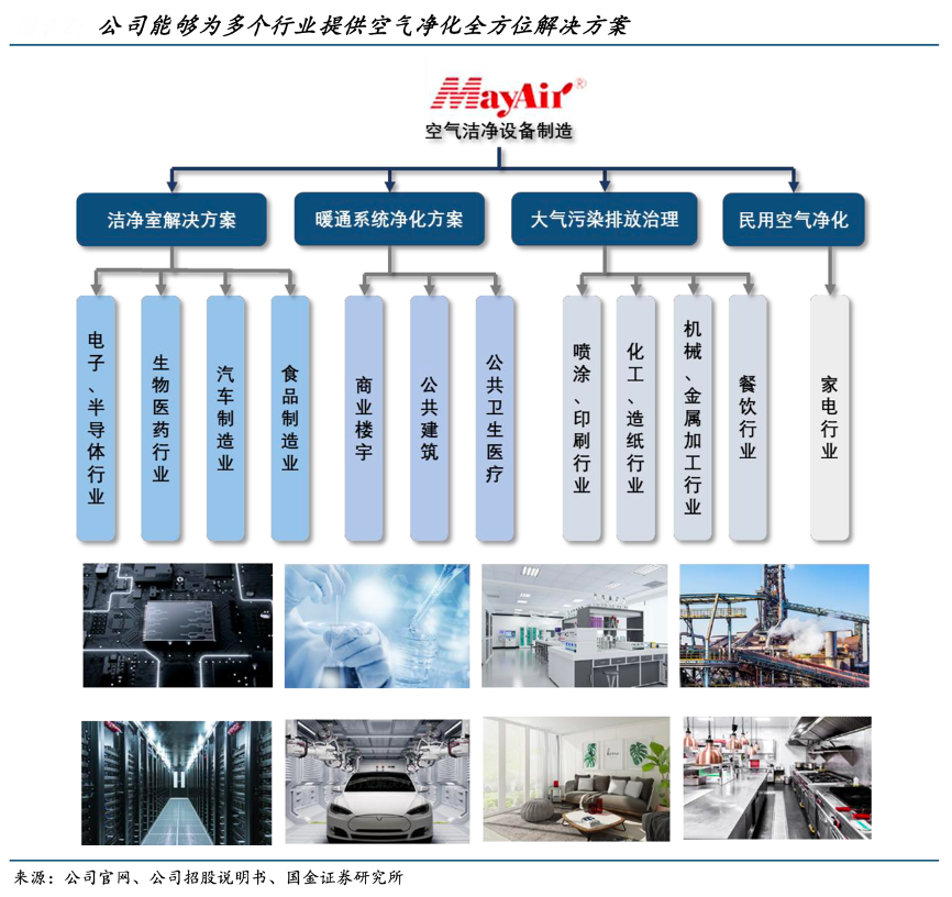 經(jīng)典案例:根據(jù)公司官網(wǎng)、公司招股說明書、國金證券研究所等綜合資訊表明,美??萍脊井a(chǎn)品下游涉及多行業(yè)場景。(1)FFU+過濾器應(yīng)用于半導(dǎo)體、生物制藥、食品加工等行業(yè)的潔凈廠房及潔凈室中;(2)空氣凈化設(shè)備用于生物制藥產(chǎn)線(生物安全、無菌凈化設(shè)備)、室內(nèi)空氣凈化(商用、醫(yī)用、家用空氣凈化機)、工業(yè)生產(chǎn)(工業(yè)除塵設(shè)備/除油霧設(shè)備)、餐飲場景(除油煙凈化器)。