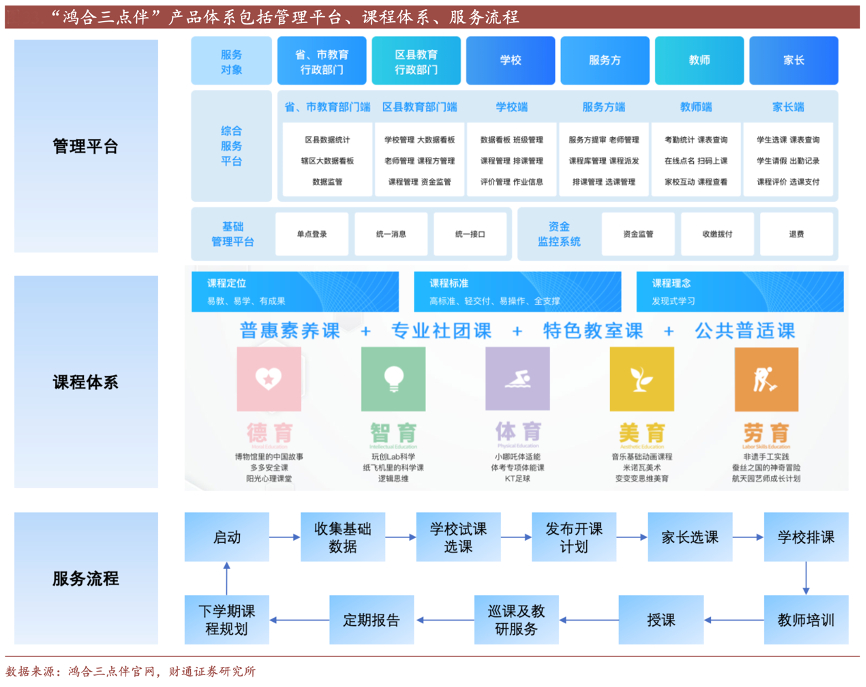 經(jīng)典案例:根據(jù)鴻合三點(diǎn)伴官網(wǎng)、財(cái)通證券研究所等綜合資訊表明,鴻合科技公司面向 K12 階段推出“鴻合三點(diǎn)伴”課后服務(wù)業(yè)務(wù),為管理部門、學(xué)校、家長、老師、服務(wù)機(jī)構(gòu)提供規(guī)范管理、高效運(yùn)營的云平臺(tái),以及“德、智、體、美、勞”五育并舉所需要的優(yōu)質(zhì)稀缺性課程,同時(shí)為客戶提供標(biāo)準(zhǔn)化、精細(xì)化的課后運(yùn)營服務(wù)。