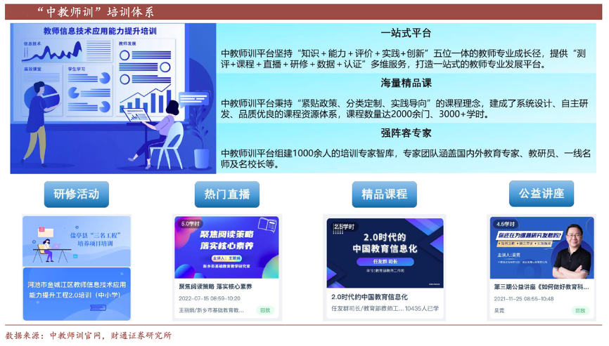 經(jīng)典案例:根據(jù)中教師訓(xùn)官網(wǎng)、財通證券研究所等綜合資訊表明,中教師訓(xùn)通過“線上+線 下”混合式培訓(xùn)與研修活動,精準(zhǔn)助力教育管理部門與學(xué)校全面提升科學(xué)管理水平 及教師專業(yè)能力。截至 2022 年底,“中教師訓(xùn)”已助力全國 14 個省份及眾多地市、 8 萬多所的一線中小學(xué)、幼兒園管理者及教師信息化管理或教學(xué)能力提升。