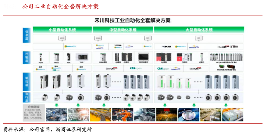 經(jīng)典案例:根據(jù)公司官網(wǎng)、浙商證券研究所等綜合資訊表明,禾川科技起步階段主要依靠 PLC 和 伺服系統(tǒng)兩大產(chǎn)品,之后相繼突破編碼器、工控芯片、智能相機(jī)等驅(qū)動(dòng)層、執(zhí)行層產(chǎn)品;公司還在工控芯片的自主可控上取得突破,公司自主研發(fā)設(shè)計(jì)的驅(qū)動(dòng)控制一體化 SIP 芯片集成了主控 MCU、存儲(chǔ)、運(yùn)動(dòng)控制算法和工業(yè)實(shí)時(shí)以太網(wǎng) IP,目前已實(shí)現(xiàn)對(duì)外銷售。