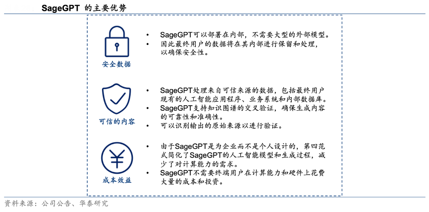 經(jīng)典案例:根據(jù)公司公告、華泰研究等綜合資訊表明,第四范式于 2023 年 3 月推出專(zhuān)為業(yè)務(wù)場(chǎng)景設(shè)計(jì)的企業(yè)級(jí)生成式 AI 產(chǎn)品 SageGPT。SageGPT 具有多模態(tài)交互和企業(yè)級(jí) AI 工具,它重新定義了最終用戶(hù)員工與業(yè)務(wù)系統(tǒng)交互的方式。