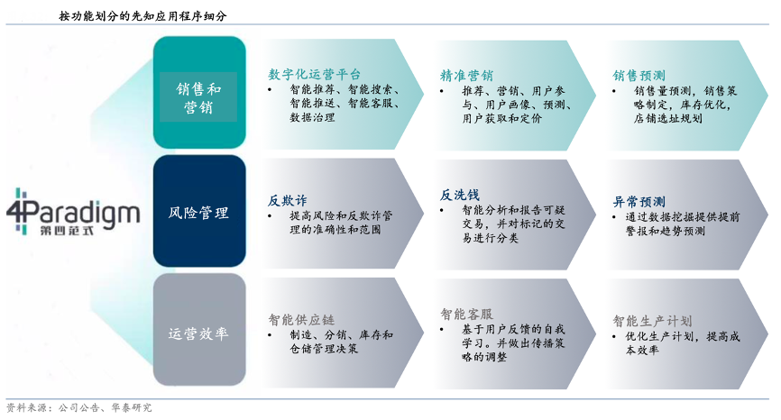 經(jīng)典案例:根據(jù)公司公告、華泰研究等綜合資訊表明,第四范式SageGPT具備用戶(hù)友好的界面,能夠處理視頻、圖像、語(yǔ)音、文本等形式的查詢(xún)及任務(wù),將該等查詢(xún)及任務(wù)傳輸至終端用戶(hù)現(xiàn)有的業(yè)務(wù)系統(tǒng)、AI 應(yīng)用及內(nèi)部數(shù)據(jù)庫(kù)進(jìn)行處理,并以所要求的形式輸出回應(yīng)。