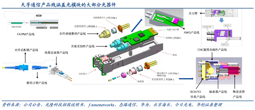 經(jīng)典案例:根據(jù)公司公告、光隆科技招股說明書、f-tonenetworks、態(tài)路通信、華為、北京海樂、今日光電、華創(chuàng)證券等綜合資訊表明,天孚通信公司目前已形成涵蓋隔離器、光纖透鏡陣列、線纜連接器等在內(nèi)的十三條產(chǎn)品線,以及包括高速光引擎、高速 BOX 器件封裝、微光學(xué)、AWG 系列光器件等在內(nèi)的九大解決方案,成為行業(yè)稀缺的光器件垂直整合一站式供應(yīng)平臺(tái),可為客戶提供組合式一攬子供應(yīng)鏈解決方案。