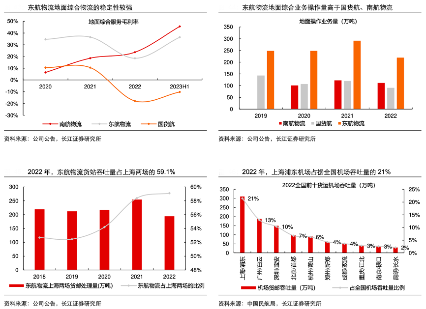 經(jīng)典案例:根據(jù)公司公告、長江證券研究所等綜合資訊表明,東航物流公司從毛利率看,因航空速運、綜合物流解決方案承擔(dān)空運干線運輸,利潤跟隨運價波動,盈利周期性較強(qiáng),2020 年以來,航空速運、綜合物流毛利率維持在較高水平。地面綜合服務(wù)以貨站收入為主,公司卡位布局核心貨站資源,穩(wěn)定賺機(jī)場貨量增長的錢,毛利率通常穩(wěn)定維持在 35%以上。