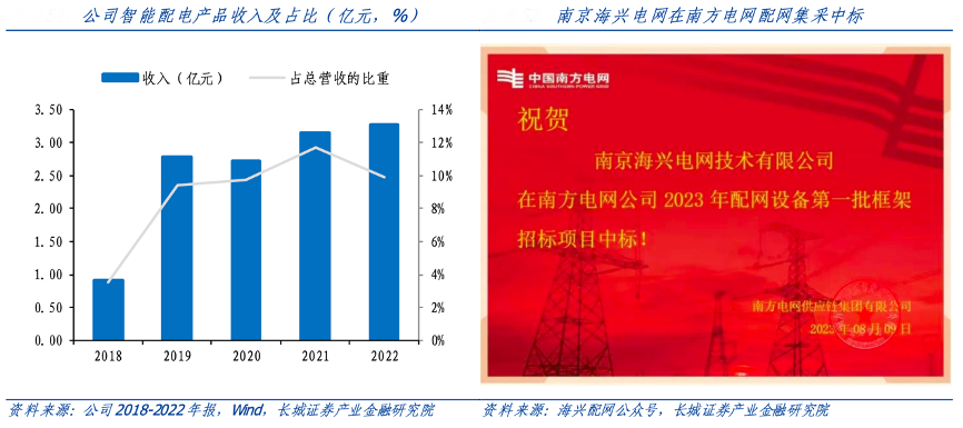 經(jīng)典案例:根據(jù)公司2018-2022年報(bào)、wind、海興配網(wǎng)公眾號(hào)、長(zhǎng)城證券產(chǎn)業(yè)金融研究院等綜合資訊表明,海興電力公司深耕配網(wǎng)自動(dòng)化方向,公司旗下南京海興電網(wǎng)在南方電網(wǎng)公司 2023 年配網(wǎng)設(shè)備第一批集采招標(biāo)中實(shí)現(xiàn)中標(biāo),中標(biāo)產(chǎn)品包含公司自主研發(fā)制造的10kV戶外開關(guān)箱配套SF6全絕緣斷路器自動(dòng)化成套柜和10kV柱上真空斷路 器自動(dòng)化成套設(shè)備,這也創(chuàng)造了公司在南網(wǎng)中標(biāo)的新紀(jì)錄,預(yù)示著公司在配網(wǎng)板塊又上 了新的臺(tái)階。