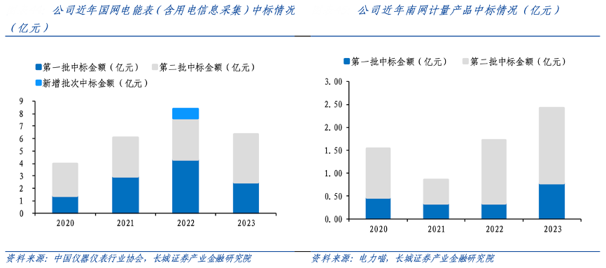 經(jīng)典案例:根據(jù)中國儀器儀表行業(yè)協(xié)會、電力喵、長城證券產(chǎn)業(yè)金融研究院等綜合資訊表明,2019-2023 年,海興電力公司國網(wǎng)和南網(wǎng)中 標金額呈快速增長態(tài)勢,2023 年度,公司國網(wǎng)和南網(wǎng)的中標金額分別為 6.36 億元和 2.42 億元。此外,海興電力與兩網(wǎng)保持融 洽合作,于2022年參與國網(wǎng)電科院“一芯一系統(tǒng)”項目開發(fā),并相繼推出了面向海外市場和國內(nèi)市場的不同產(chǎn)品。
