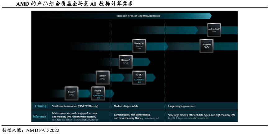 經(jīng)典案例:根據(jù)AMD FAD 2022、國泰君安證券研究等綜合資訊表明,AMD已經(jīng)擁有了業(yè)內(nèi)最全的 CPU+GPU+FPGA+DPU 數(shù)據(jù)中心產(chǎn)品組 合,可以覆蓋全場景 AI 數(shù)據(jù)計算需求:銳龍 CPU、EPYC CPU 將用于 訓(xùn)練和推理小到中型模型;搭載 AI 引擎的 EPYC CPU、Radeon GPU 和 Versal 芯片將覆蓋用于訓(xùn)練和推理中型到大型模型。