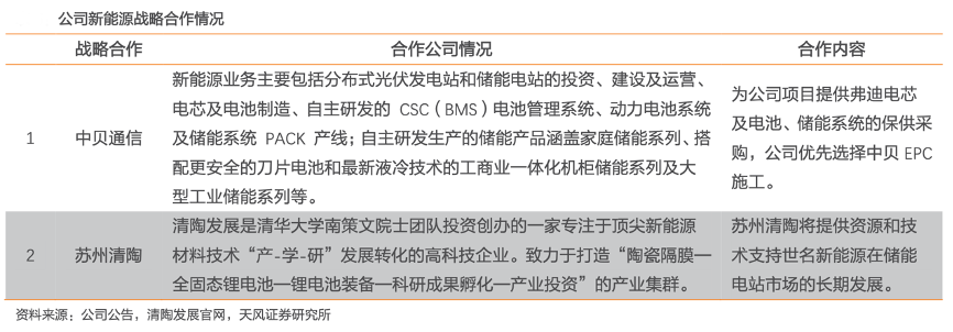 經(jīng)典案例:根據(jù)公司公告、清陶發(fā)展官網(wǎng)、天風(fēng)證券研究所等綜合資訊表明,世名科技公司與中貝通信、清陶等新能源公司近期分別達(dá)成戰(zhàn)略合作。2023 年 8 月,公司公告與中 貝通信達(dá)成戰(zhàn)略合作,將以新能源的光伏發(fā)電和儲能系統(tǒng)業(yè)務(wù)為主線,全力構(gòu)建多能互聯(lián)、 多業(yè)協(xié)同、多點(diǎn)盈利的清潔能源生態(tài)系統(tǒng)。