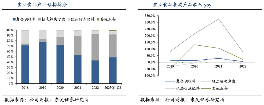 經(jīng)典案例:根據(jù)公司財(cái)報(bào)、東吳證券研究所等綜合資訊表明,寶立公司主營業(yè)務(wù)分為復(fù)調(diào)、輕烹解決方案和飲品甜點(diǎn)配料。2021 年公司收購廚房阿芬 75%股份后,空刻意面業(yè)務(wù)并入輕烹解決方案收入。復(fù)調(diào)和輕烹業(yè)務(wù)現(xiàn)在系公司收入兩大基石,2023Q1-3 復(fù)調(diào)、輕烹業(yè)務(wù)收入占比分別為 49%/43%。