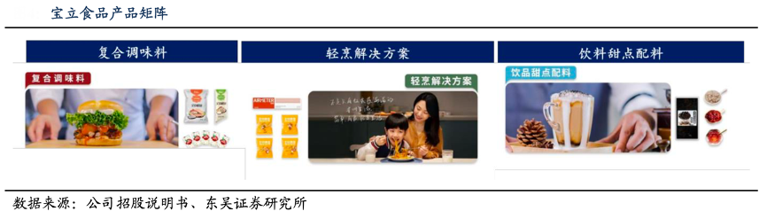 經(jīng)典案例:根據(jù)公司招股說明書、東吳證券研究所等綜合資訊表明,寶立食品公司產(chǎn)品以粉體、醬汁類復(fù)調(diào)為主,擴(kuò)展輕烹業(yè)務(wù)與飲品甜點配料,產(chǎn)品線不斷豐 富。公司深耕復(fù)合調(diào)味料領(lǐng)域多年,將西方主流快餐經(jīng)典口味引入中國市場,并持續(xù)不 斷地研發(fā)新式西餐口味、迎合中國大眾消費市場向市場推出新產(chǎn)品。