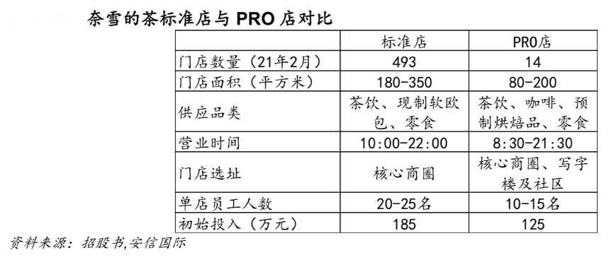經(jīng)典案例:根據(jù)公司招股書(shū)、安信國(guó)際等綜合資訊表明,除了在全國(guó)快速擴(kuò)張奈雪的茶標(biāo)準(zhǔn)茶飲店外,奈雪的茶公司從 2020 年 11 月開(kāi)始推出深入高級(jí)寫(xiě)字樓的“奈雪PRO店”。這是奈雪的新發(fā)展策略,截止 2021 年 2 月 5 日已經(jīng)開(kāi)設(shè)了 14 家門(mén)店,預(yù)計(jì)未來(lái) 70%的門(mén)店將為奈雪 PRO 店。與 PRO 店與標(biāo)準(zhǔn)店的主要區(qū)別在于: 其移除了現(xiàn)場(chǎng)烘焙區(qū)域,面積更小,人員更精簡(jiǎn)。PRO 店仍保持大店模式,面積在 80-200 平米間,但較標(biāo)準(zhǔn)門(mén)店更小一些。預(yù)制產(chǎn)品由深圳的中央廚房制作,可覆蓋深圳全市。
