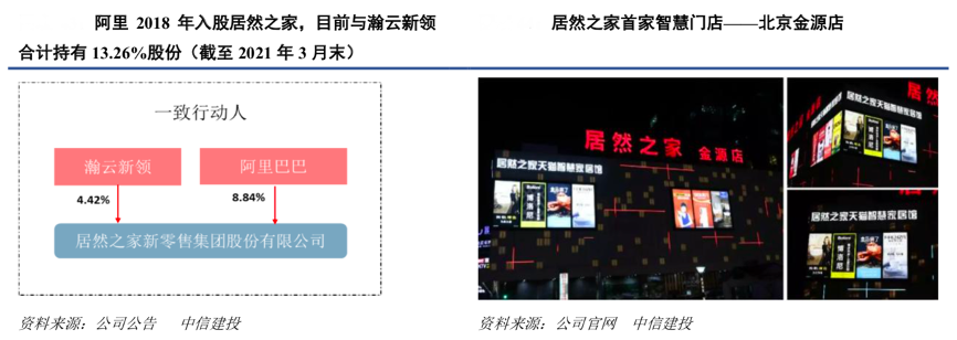 經(jīng)典案例:根據(jù)公司公告、公司官網(wǎng)、中信建投等綜合資訊表明,居然之家 2018 年初開始與阿里巴巴達(dá)成深度戰(zhàn)略合作,以大數(shù)據(jù)平臺(tái)建設(shè)為核心,全面推進(jìn)線上線下融合,打造家居新零售新模式。2018 年 2 月 11 日,阿里巴巴以 54.53 億元收購(gòu)居然之家 15%股份,借殼上市后目前阿里持有公司股份 8.84%成為公司第三大股東,借助阿里巴巴強(qiáng)大的大數(shù)據(jù)、云計(jì)算、智能硬件等零售技術(shù)能力,居然之家圍繞賣場(chǎng)數(shù)字化、線上增量平臺(tái)、門店存量轉(zhuǎn)化等三方面對(duì)賣場(chǎng)進(jìn)行持續(xù)改造升級(jí)。